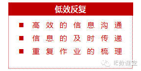 低效很大一部分是因为信息,为了实现高效需要组织流程有完善的信息沟通机制,并且确保信息沟通的及时和准确,这个过程中也要同步清理掉那些发现的重复的作业。