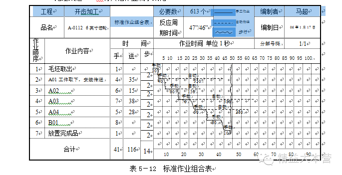 (4)标准作业组合表的制作方法 表5-12是在事例演练中使用的另外一个表格,既标准作业组合表。编制标准作业组合表时,参照该表加以比较编制表格。编制顺序如下: 顺序1 将反应时间用红线画出 反应时间=总运转时间÷必要数 顺序2 判定一个人是否可以完成 使用演练用的零件别能力表,通过手动作业时间和步行时间的和来判定在反应时间内是否可以完成。 顺序3 在作业内容栏记入工程作业的内容 顺序4 在时间栏记入各自的时间 顺序5 将手( )、送( )、步( )的时间记入表格。 自动传送时间超过反应时间时,将该部分由0秒的位置引出。 顺序6 检查作业组合 虽然将超过反应时间的自动传送时间从0秒处引出,但仍有时会和手动作业时间重合。这时,就会发生等待,意味着作业组合不成立。 在这种场合,只有再次对作业进行修正或着手进行改善。希望现场不要默认待工浪费的存在。 顺序7 确认是否可以在反应时间内完成作业 将全部作业完成之后,步行返回到作业顺序1的位置,确认和反应时间的重合情况。 ·和红线完全重合………作业组合很合适 ·超过红线………对超过的部分进行改善 ·比红线短………将其他作业流水线化