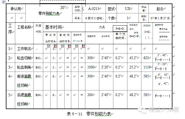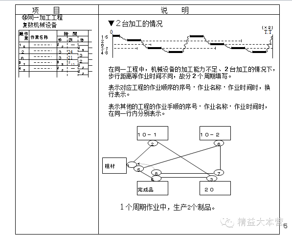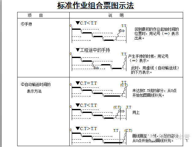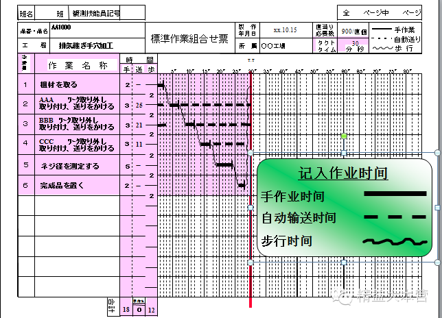 点击标题下面蓝色字体“精益大本营”地方即可关注我们精益平台,订阅后,点击"查看历史消息”查看精益全章! (2)标准作业组合表和标准作业表的编制方法 即使在头脑中对标准作业组合表及标准作业表有充分的理解,但在实际记入的时候,仍会觉得有些地方很不好写。因此,最好在现场实际的作业状态标准化之前,通过一个事例进行简单的演练。 以“表5-11 零件别能力表的制作方法”中所示的零件别能力表为基础,按下面的条件1和条件2编制标准作业组合表和标准作业表。 条件1 加工工程的顺序 毛坯—A01—A02—A03—A04—B01—完成品 条件2 必要数613个/日 ① 总运转时间为每天7小时50分,中间无短暂休息。 ② 作业者的步行时间全部按2秒计。 ③ 在该事例的演练中,假定无刃具更换,所以不进行考虑。 编制顺序 ① 计算反应时间 反应时间=当日总的运转时间/当日的必要数 ② 编制标准作业组合表 在时间轴上,将①的反应时间用粗红线标出。 ③ 编制标准作业表 其要点为标准作业待工数达到多少。 (3)零件加工能力表的制作方法 表5-11的表格是“零件加工能力表”,将在标准作业组合表和标准作业表的编制中使用。另外,这之后的页面,可以在标准作业组合表和标准作业表编制之后加以参照。 该表的编制顺序如下所示。 ① 工序………工程的顺序号码 ② 工程名称……作业或者工程的名称 ③ 机器代码……所用的机器的代码 ④ 基本时间 ·手动作业时间( 直线 )……记入作业者在各工程的作业时间。 ·自动传送时间( 虚线 )……机械加工工件的时间。 ·完成时间……………………在工程中,完成一个工件的加工所需要的时间。 完成时间=手动作业时间+自动传送时间(直列作业式)。 ⑤ 刃具 ·更换个数………记录更换的个数 ·更换时间………记录更换的时间 ·单个的更换时间=更换时间÷更换个数 ⑥ 每个的合计时间=完成时间+单个的更换时间 ⑦ 加工能力………1天特定时间所能做出的个数 =当日总的运转时间÷单个的合计时间 ⑧ 图示时间………手动作业时间( )和自动传送时间( )用图记入。比如2个工序的场合,表示方法如下,在记入标准作业组合表时,做到一目了然。 具 ·更换个数………记录更换的个数 ·更换时间………记录更换的时间 ·单个的更换时间=更换时间÷更换个数