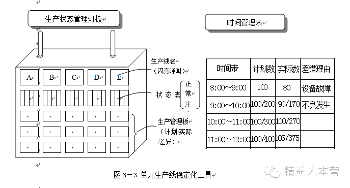 为了实现单元生产线的稳定化必须采用目视管理工具。特别是状态指示灯和时间管理表(图6-3)是生产状况的正常/异常表示的重要工具。状态指示灯有不少种类,但是有代表性的是带有显示生产进度、设备故障、工程内不良功能,并有呼叫功能。根据它生产干部对问题进行快速处理,保证单元生产线的正常运行。