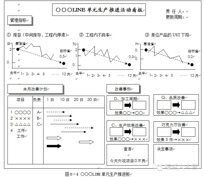 相关管理指标有Q(品质)、C(生产性)、D(库存)三个项目,根据改善方针追加生产节拍﹑区域、设备故障率等2~3个项目。图6-4事例包括压缩(WIP)库存、工程内不良率、生产效率的UST改善等三个项目指标基准,还有设定改善实际值与目标值的目标管理的表现方法。