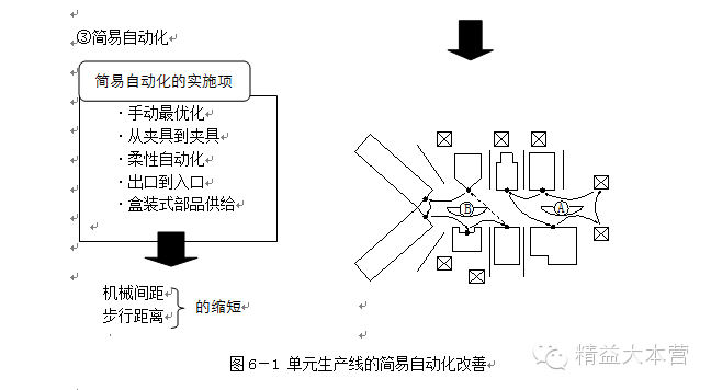 还有其他不用人手,而是“从夹具到夹具”的方法,在机器中取出工件的自动化,代替人的动作压缩了作业时间。这样可以节省人的部分工作。简易自动化的改善不能就这么简单就结束,用LCIA方法进一步推进到完全节省一个人的程度,并且还要兼顾产品的多样性。