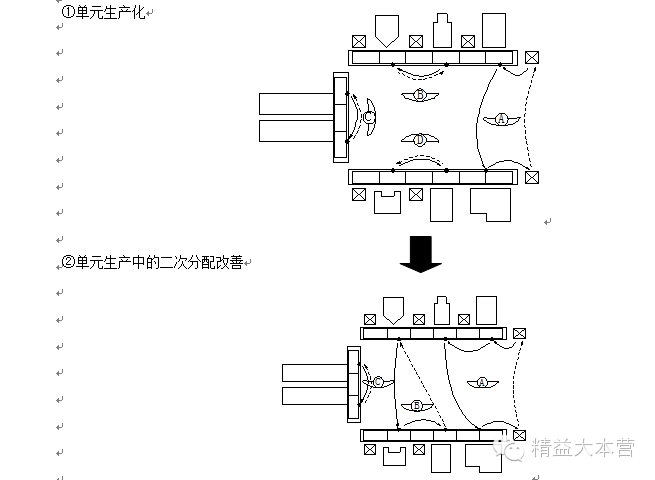 实现单元生产化后,现场已大量消除了传统生产中的步行、寻找物料、工艺等待等等浪费,生产效率提升了。随着生产作业的逐步熟练,会发现第四步中设定的标准作业必须进行再次改善的一些现场问题。图6-1①的案例中中发现生产等待,拿取物料或夹具的操作不便等问题。首先从简单的改善开始,根据各工序的作业周期时间把原先的作业内容进行再次分配,改善后的新工艺为标准作业(图7-1②)。根据新的标准作业进行一个流生产,产生了新的生产周期或生产工艺规格,之后再次暴露浪费和异常,并在日程作业记录中记录。