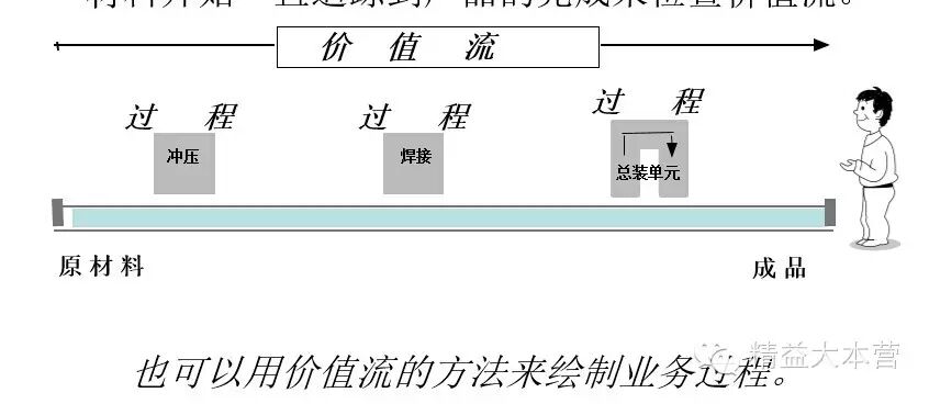 所谓价值流,是当前产品通过其基本生产过程所要求的全部活动。这些活动包括给产品增加价值和不增加价值两部分,包括了从产品最基本的原材料阶段一直到产品交付顾客的全部过程,如一辆汽车的制造,包括了从顾客要求到概念设计、产品设计、样车制造、试验、定型、投产到交付后的使用、信息反馈和回收过程,会经历很多车间、工厂、公司,甚至可能经历过多个国家和地区。