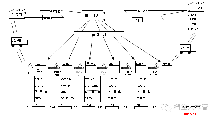 绘制价值流图析现状图的意义就在于通过图析发现工厂生产过程中存在的浪费,从图1我们可以看出,188秒的生产时间只占然整个周期时间23.6天的不到1%,大量的时间浪费在库存和等待上了。通过分析原因,找出关键的浪费及其改进的方案并予以实施——即通过实施精益生产来消除产品价值流中的浪费。分析现状的目的在于解决价值流中的问题,而这些问题要在未来状态图的制定中通过实施精益价值流来予以解决。