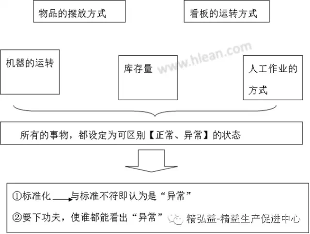 1-4-1.目视管理 所谓目视管理是指设置现场,使谁都能看出哪儿异常哪儿正常。因此,先要对现场的所有事物都进行标准化,考虑怎样才能使那些不合标准的异常情况使谁都能看出来。