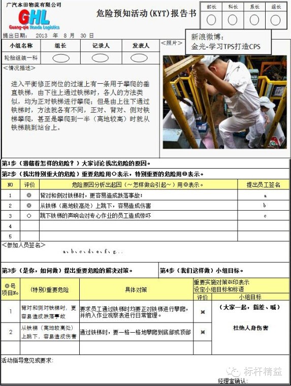 根据以上要求,我们制作了针对班组长的教育资料,并根据这些要求设计了1页A4纸的KYT活动报告书,将活动的步骤、要点反映在表格内,使现场展开活动简单化、标准化,下图为笔者所在公司实际推行的活动案例。