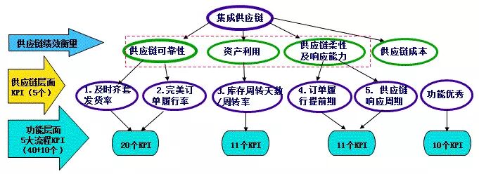 1、KPI定义:KPI是衡量公司及各责任中心、各部门、人员绩效的关键指标体系。但它首先是为实现经营目标而设定的战略管理指标体系。 2、KPI作用:KPI是企业战略管理的工具—把公司战略目标与员工个人的日常工作联系起来。 业界测评供应链的绩效体系有SCOR模型中列举的KPI指标,另外一种采用平衡记分卡BSC。SCOR虽然很全面,但是往往不能直接拿来作为定义供应链和S&OP的考核指标,最简单的理由就是企业往往是采用统一的标准来衡量各个部门的绩效,一般就用BSC。当然SCOR的指标过于理论化也是一项主要原因。