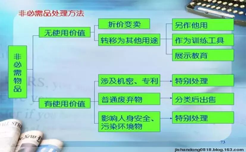 5.1 设定废弃处理小组 5.2设定不要物品回收制度. 5.3 设定循环,变卖,转换,烧毁,掩埋等处理方法 5.4 尽量不制造不要物品