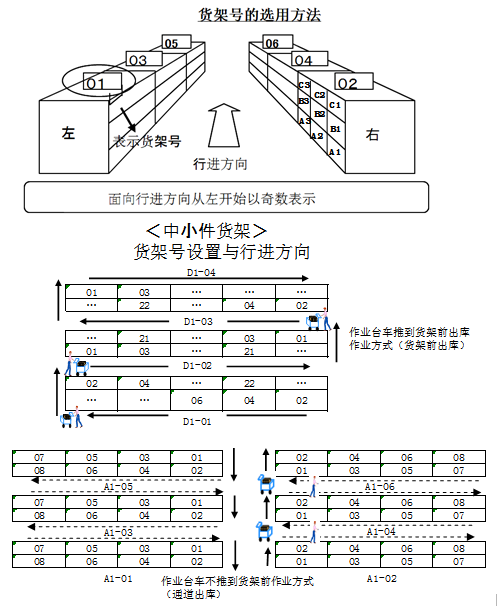 GTMC站在作业者的立场,对货架和间口的编号方法设定了规则,部分编号规则和走行路线如下图4所示。